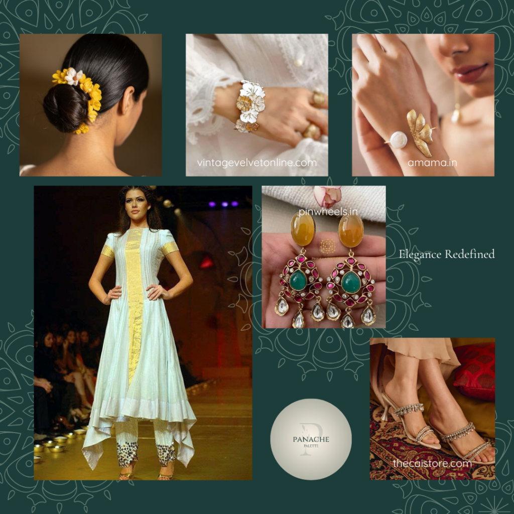 This curated Indian look is all about refined elegance with carefully chosen pieces that balance tradition and trend. From the structured silhouette to delicate floral accessories and bold statement jewels — every element speaks to the woman who embraces both subtlety and strength.