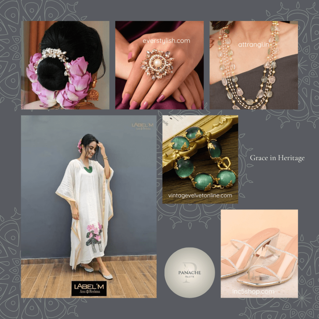 “Grace in Heritage” is about embracing traditional femininity in a modern, unfussy way. Each piece is thoughtfully chosen to highlight elegance, comfort, and fluidity. The floral details, pearl accents, and gemstone touches bring together a harmonious blend of old-world beauty and contemporary fashion.