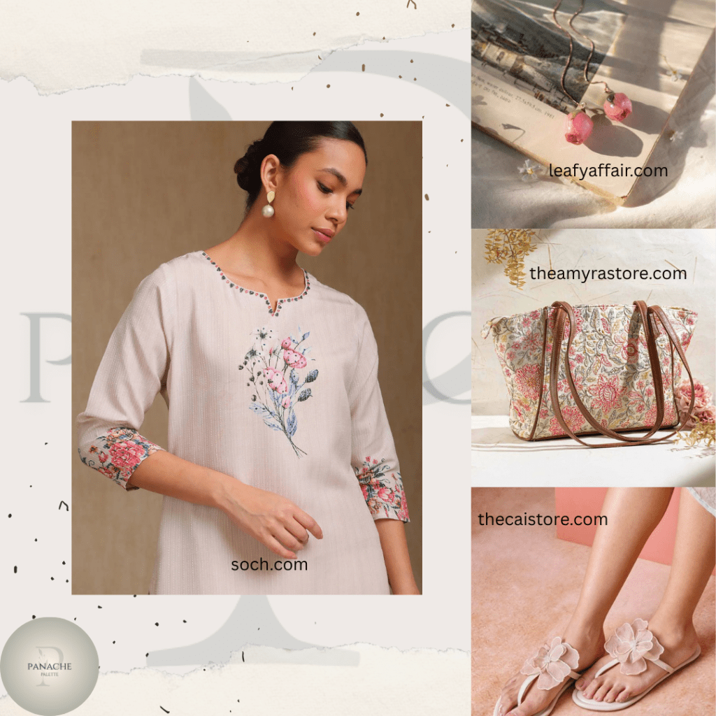 This look is a delicate celebration of nature-inspired elegance, tailored for effortless daywear. With floral details and pastel hues, it strikes a perfect balance between feminine charm and relaxed comfort—ideal for casual outings, brunch dates, or a serene day at work.