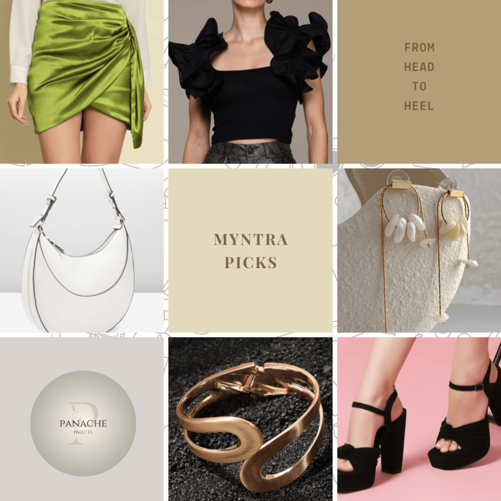This mood board is a glam-meets-bold showcase of coordinated fashion elements, handpicked from Myntra. From dramatic silhouettes to sculptural accessories, this look is all about confidence, edge, and elevated evening style. Perfect for parties, special dates, or stylish get-togethers, this curation brings you a full outfit – from top to toe.
