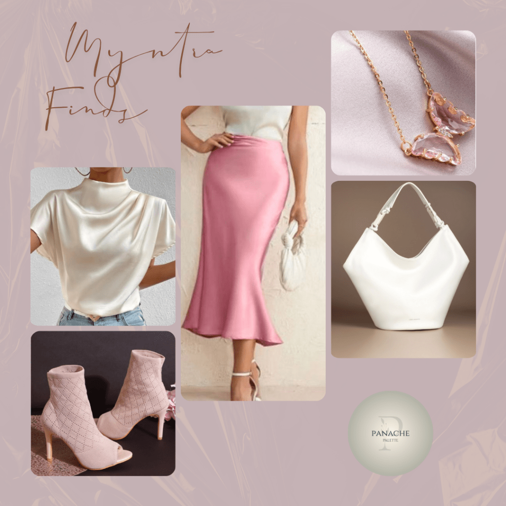 This curated ensemble from Myntra is a masterclass in soft sophistication, blending satin textures and pastel hues to create a graceful, feminine look perfect for brunches, semi-formal events, or romantic dinners. Every element of this outfit exudes charm, elegance, and understated luxury.