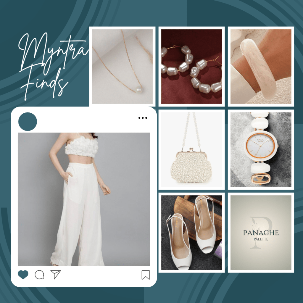 This visually elegant collage presents a chic all-white ensemble curated with a soft, ethereal aesthetic — every item is sourced from the Myntra shopping app, offering a cohesive look ideal for elegant summer outings, cocktail events, or a classy brunch date. Let’s explore the details of this curated look: