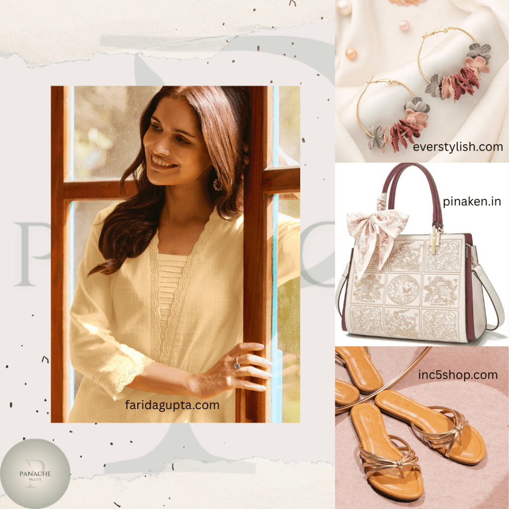 This look embodies a soft, feminine glow — an outfit rooted in simplicity and sophistication. Perfect for serene brunches, festive get-togethers, or peaceful day outings, the overall vibe is warm, natural, and gently festive.