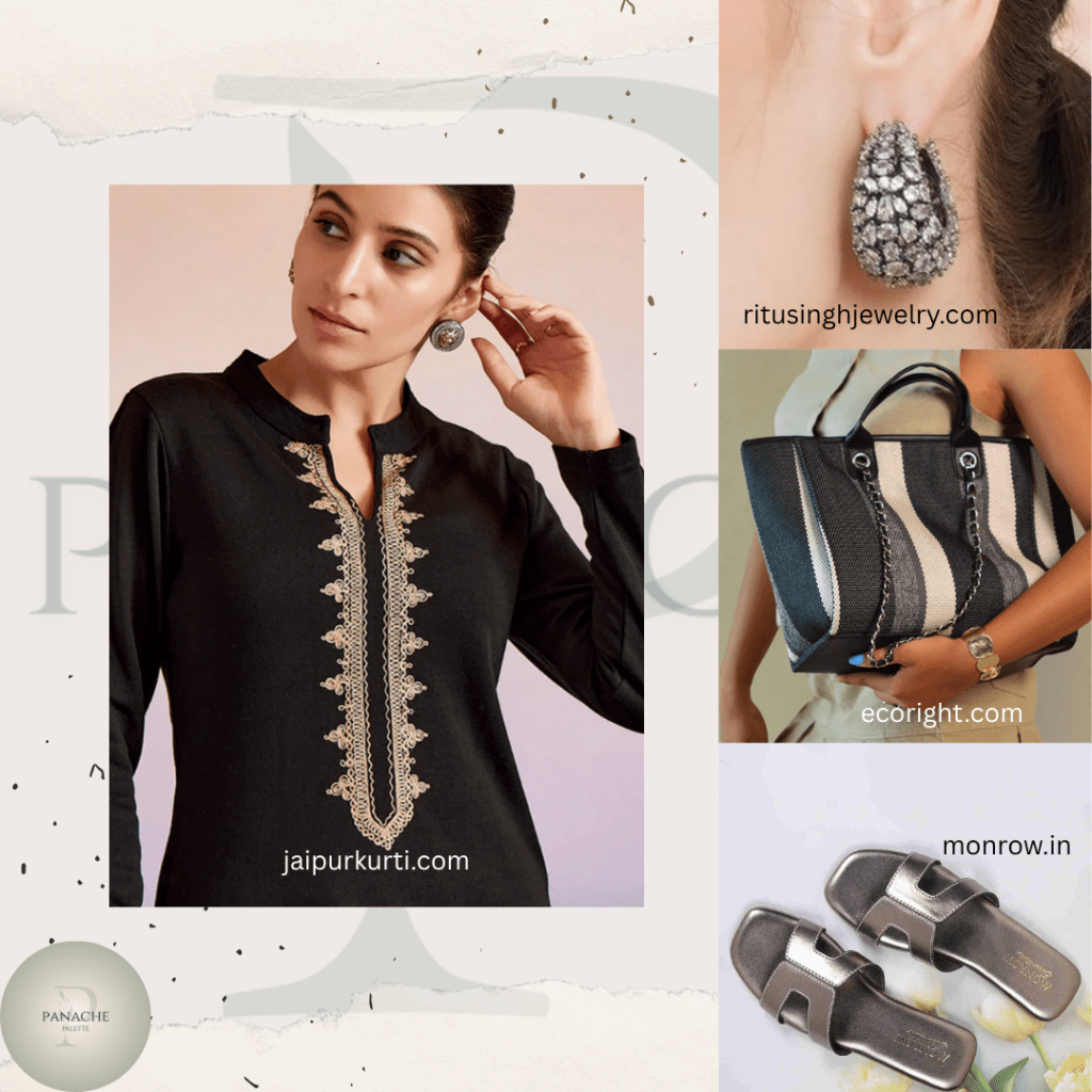This ensemble exudes understated elegance with its seamless blend of traditional detailing and contemporary styling. The curated look is perfect for formal gatherings, festive luncheons, or even an elevated everyday look.